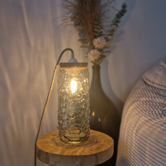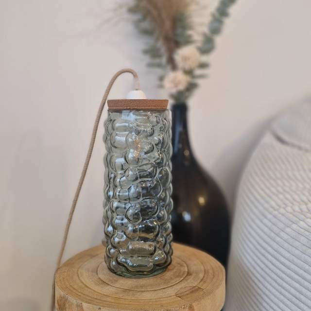 Lampe à poser à partir d'un vase chiné. Sa forme organique originale crée et diffuse un doux reflet. Idéale pour créer une atmosphère chaleureuse et apaisante..