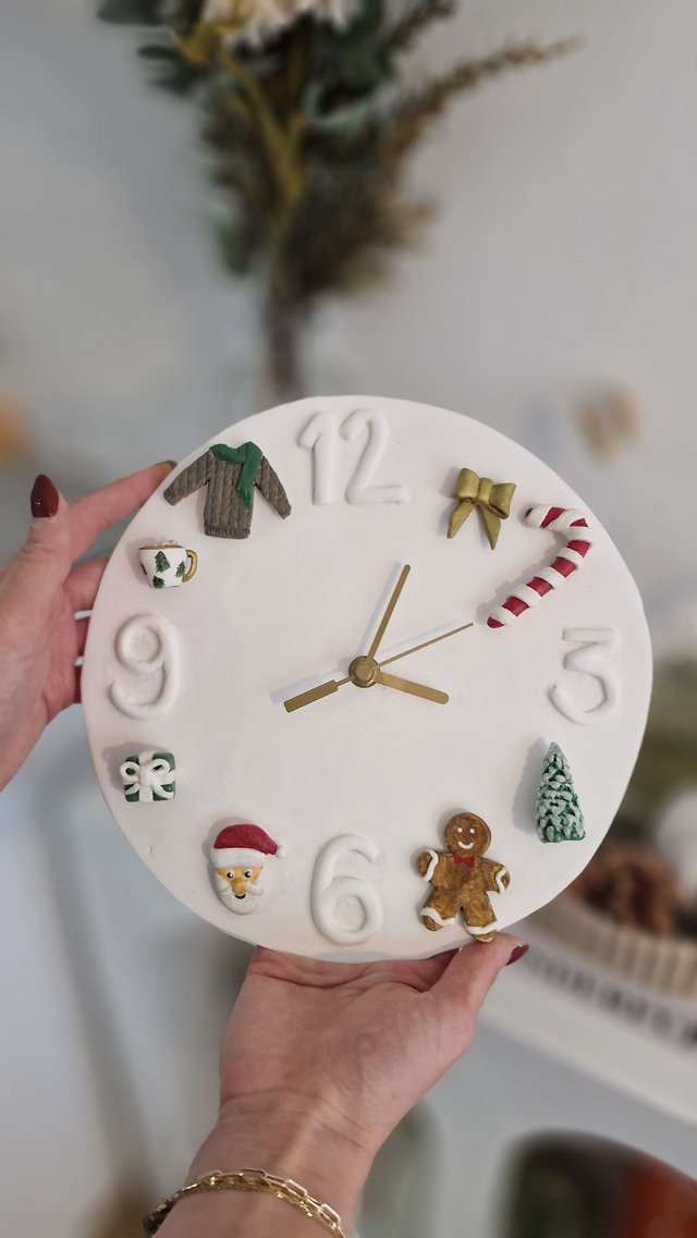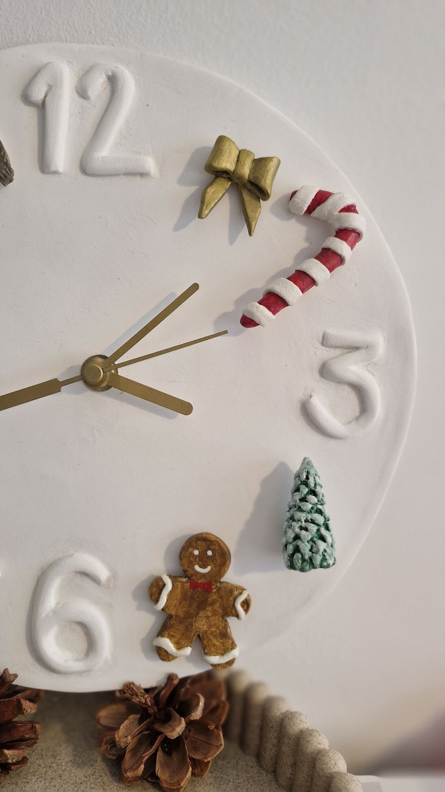 Horloge réalisée en argile auto-durcissante. Elle est composée d'un cadran et d'un socle. Il s'agit d'une horloge personnalisable car elle est garnie d'aimants interchangeables au fil des saisons, des fêtes ou simplement de tes envies. Une fois l'horloge adoptée, tu pourras par la suite acquérir des nouveaux thèmes d'aimants pour varier les plaisirs et la contempler tout au long de l'année. Celle-ci est sur le thème de "Noël".