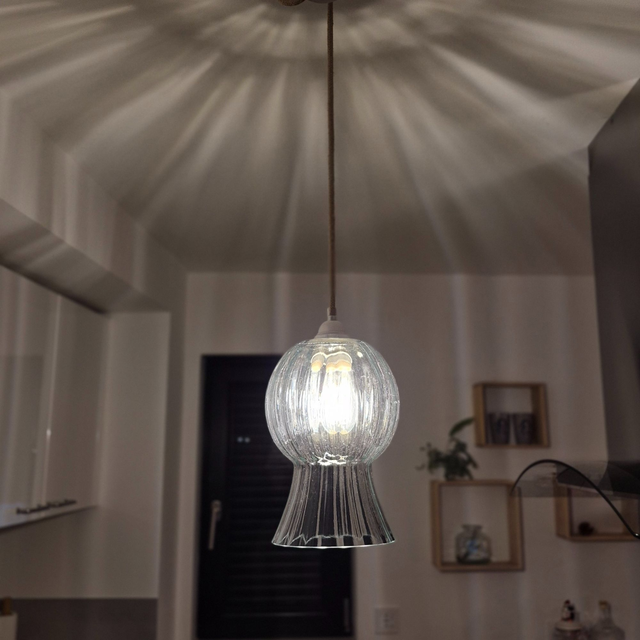Lampe plafonnier à suspendre. Le globe est un vase revisité. Sa forme et ses stries créent des projections étoilées.