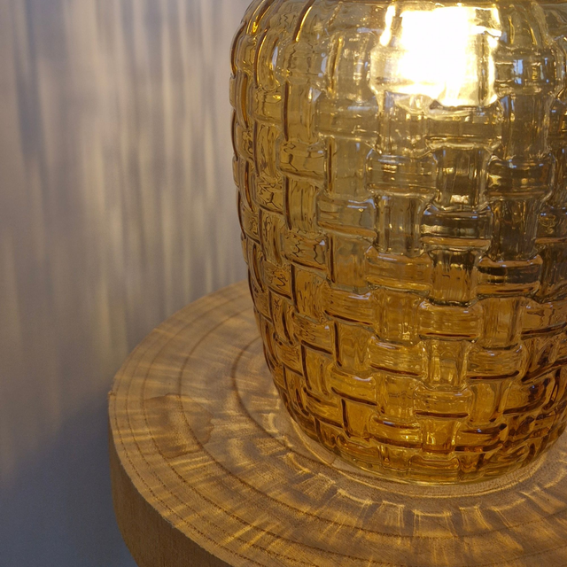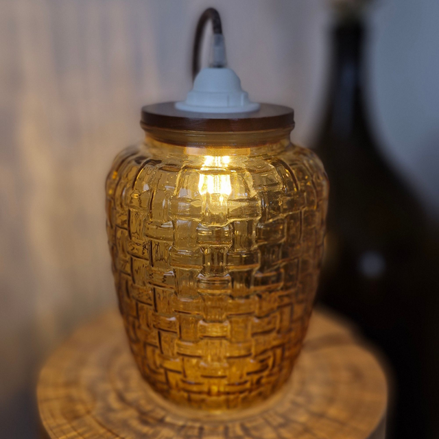 Lampe à poser à partir d'un pot chiné. Sa couleur et ses motifs créent une lumière tamisée et des reflets texturés. Elle permet une lumière douce et cocooning. Elle peut être placée sur une console, une table de chevet ou encore un meuble plus imposant, elle est un objet de décoration à part entière dans votre maison, autant allumée qu'éteinte.